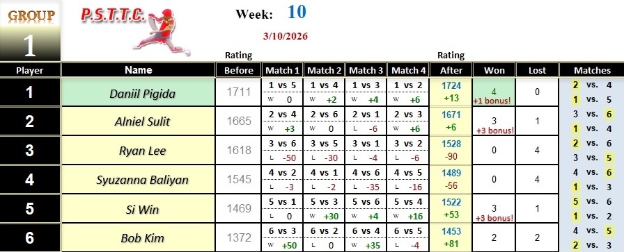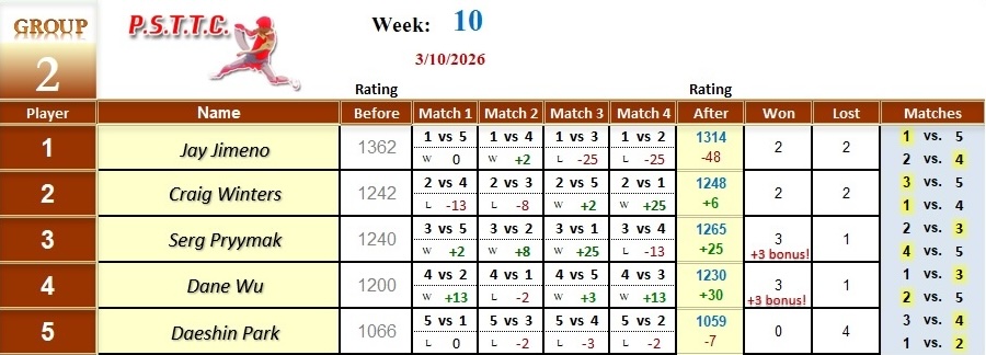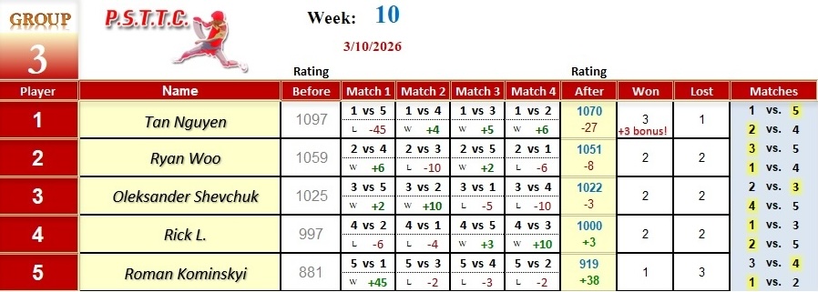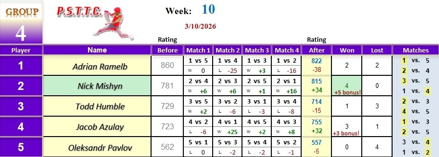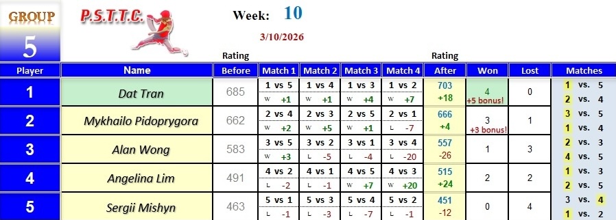 Please see below the results from last Tuesday’s league at PSTTC. Congratulations to Daniil, Nick, and Dat; they all were 4 and 0! 👏