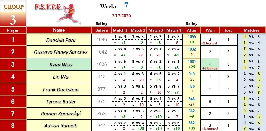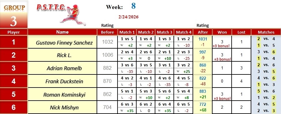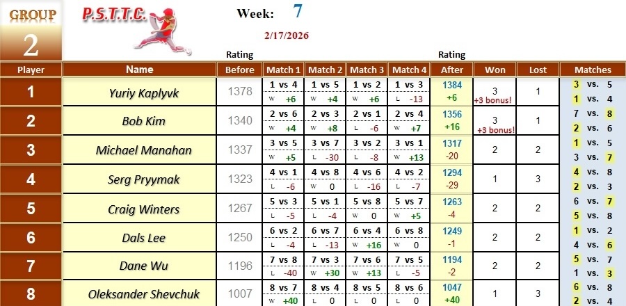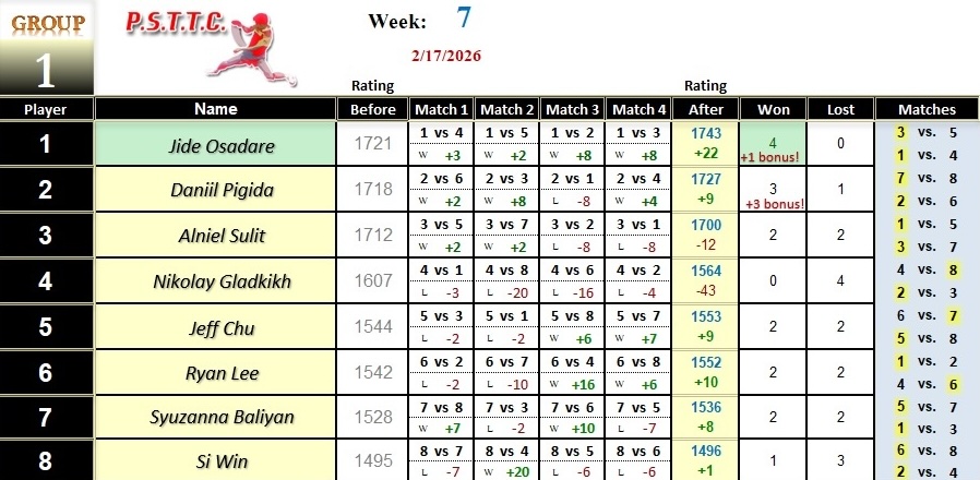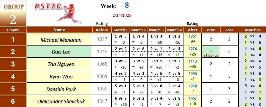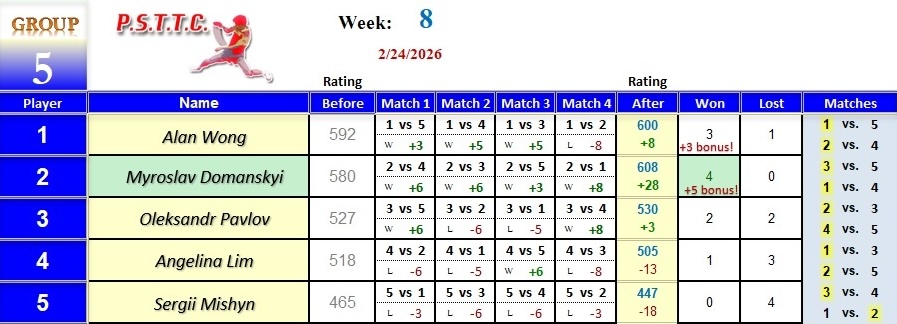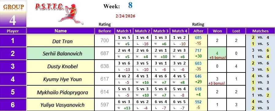 Please see below the results from last Tuesday’s league at PSTTC. Congratulations to Daniil, Dals, Serhii, and Myroslav; they all were 4 and 0! 👏