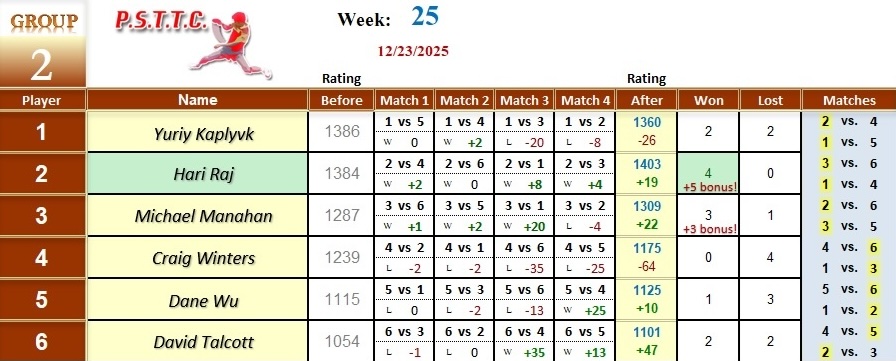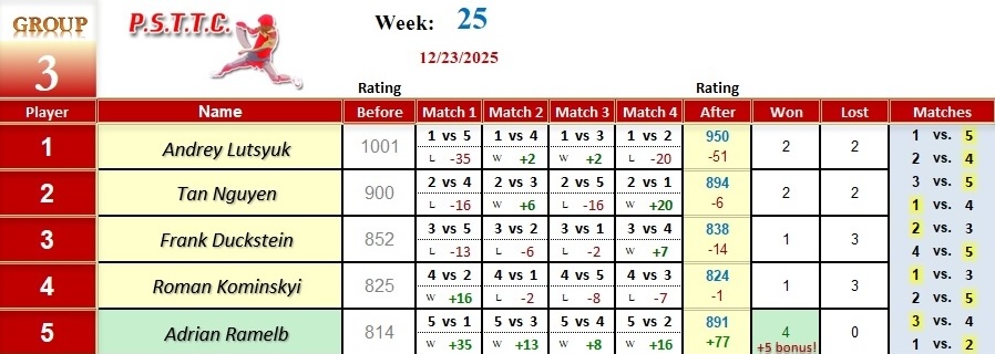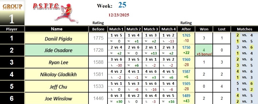 Week 25 PSTTC League Results 2025B