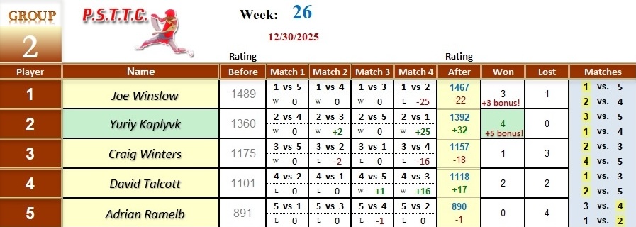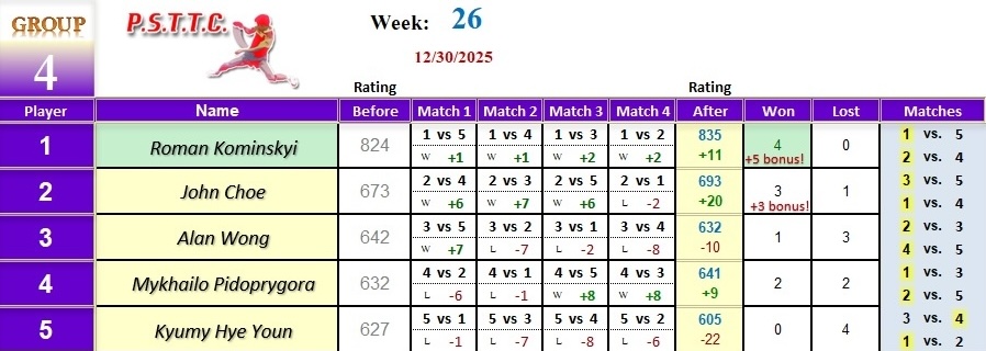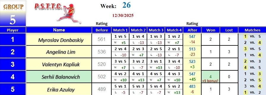 Please see below the results from last Tuesday’s league at PSTTC. Congratulations to Yuriy, Roman, and Serhii; they all were 4 and 0! 👏