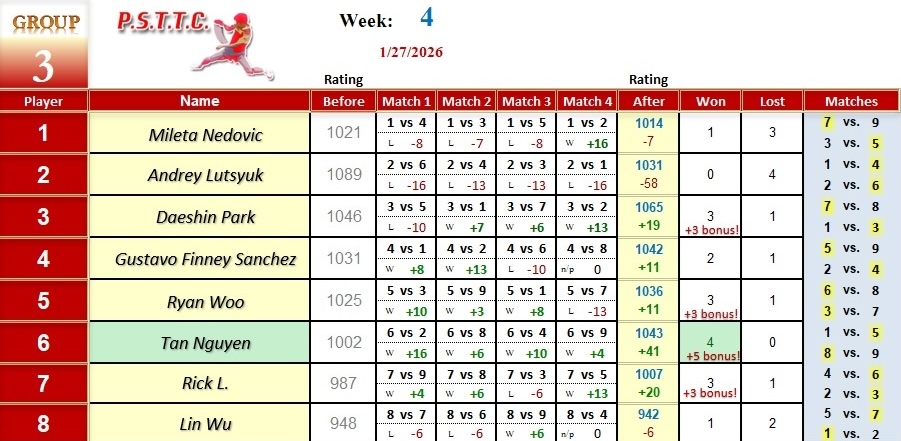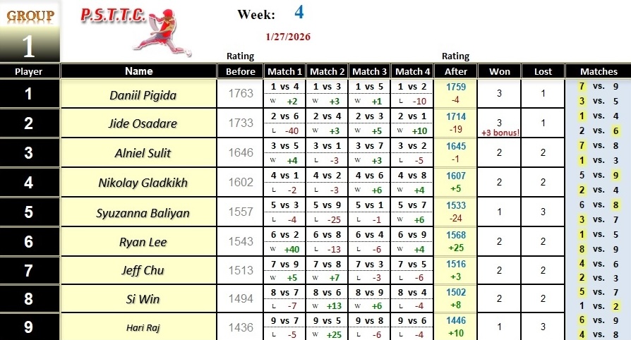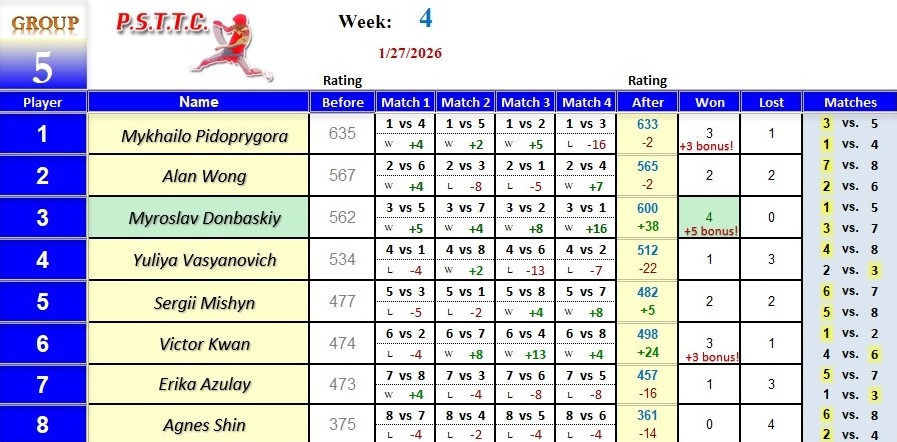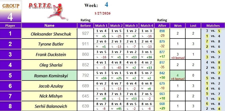 Please see below the results from last Tuesday’s league at PSTTC. Congratulations to Tan, Roman, and Myroslav; they all were 4 and 0! 👏