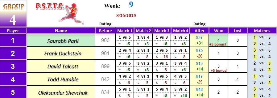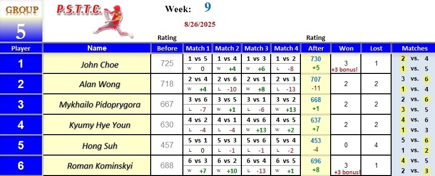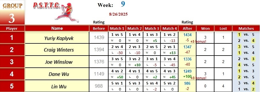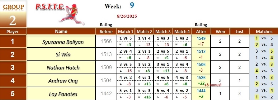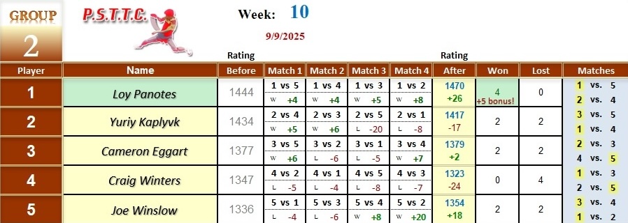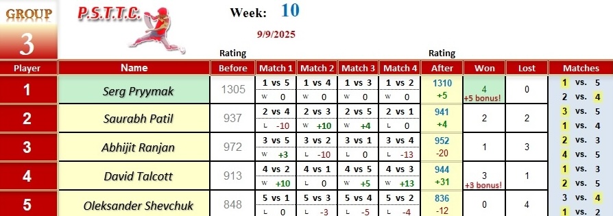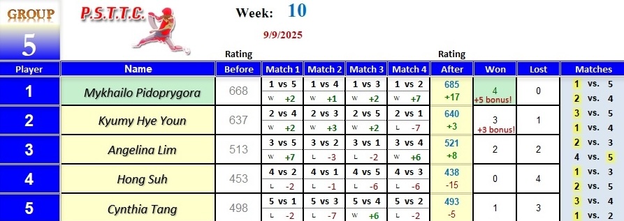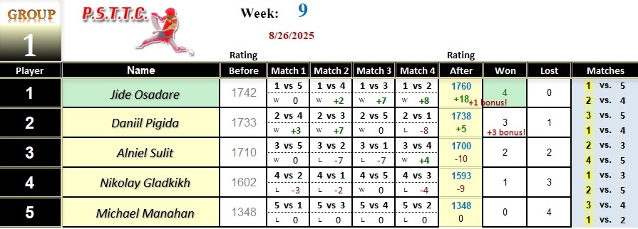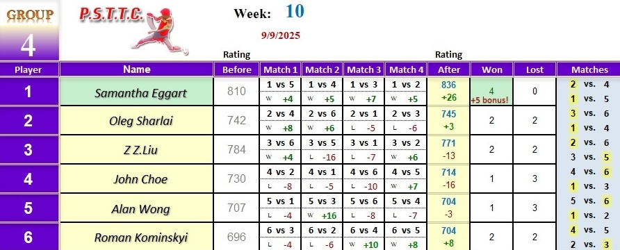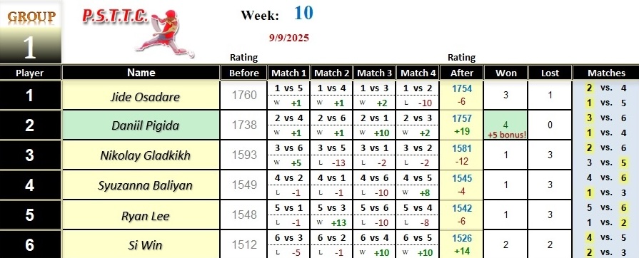Please see below the results from Tuesday’s league at PSTTC. Congratulations to Daniil, Loy, Serg, Samantha, and Mykhailo; they all were 4 and 0! 👏