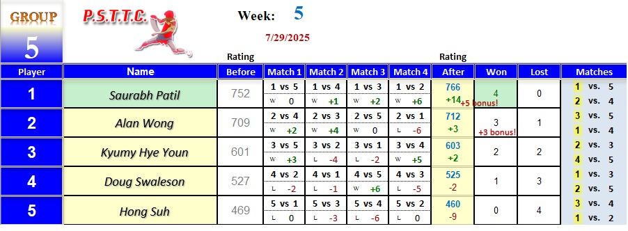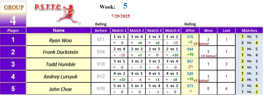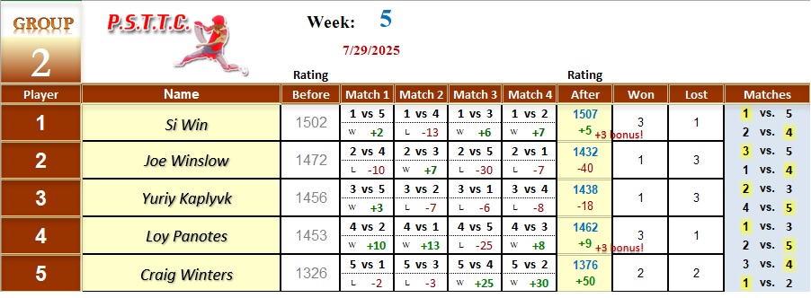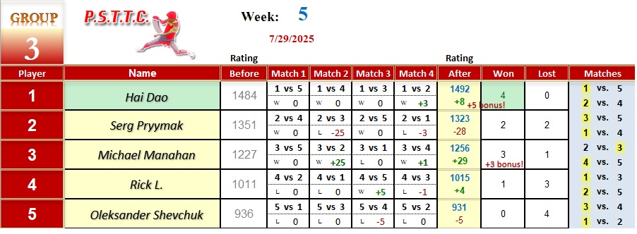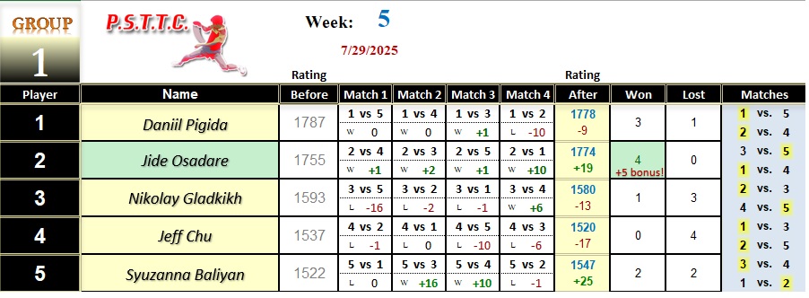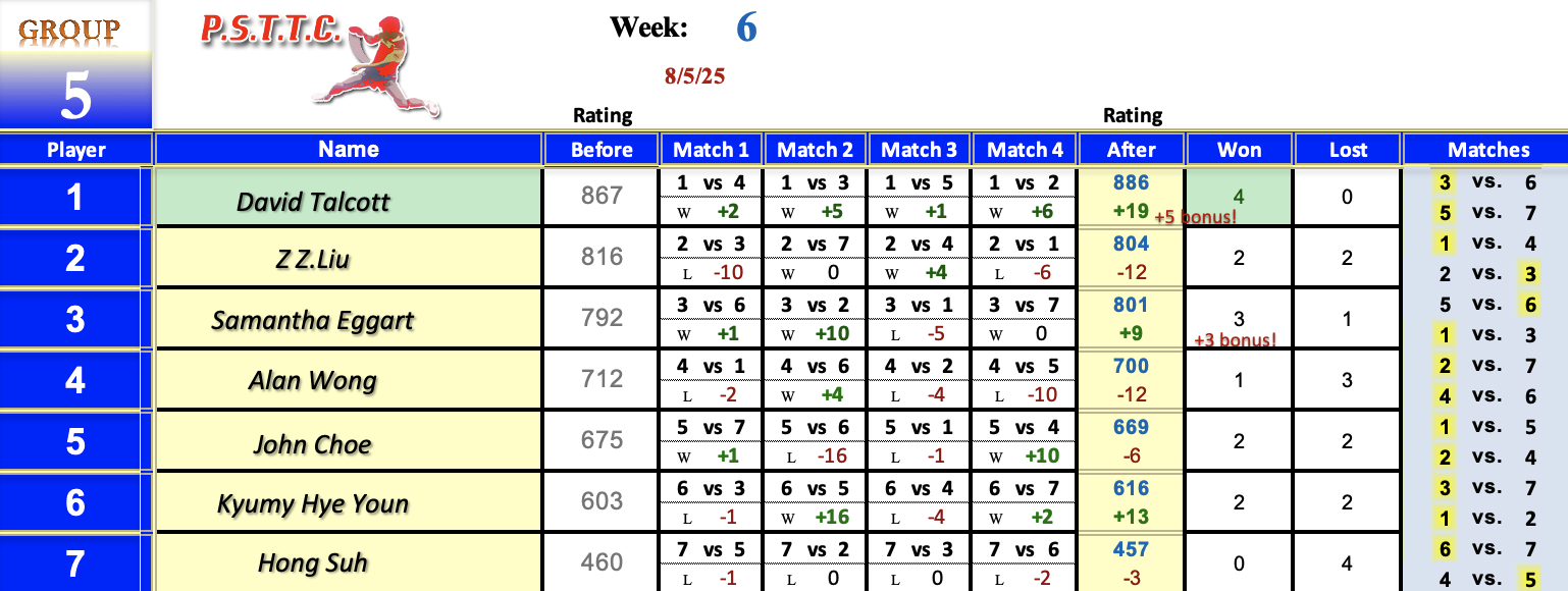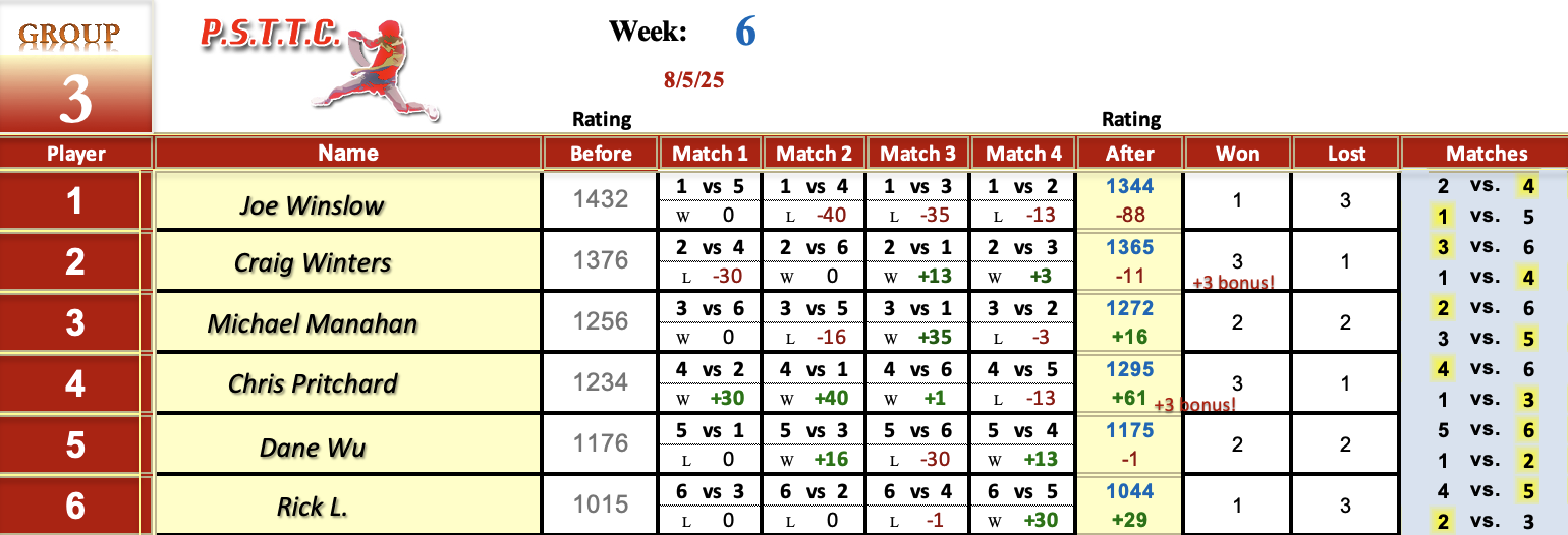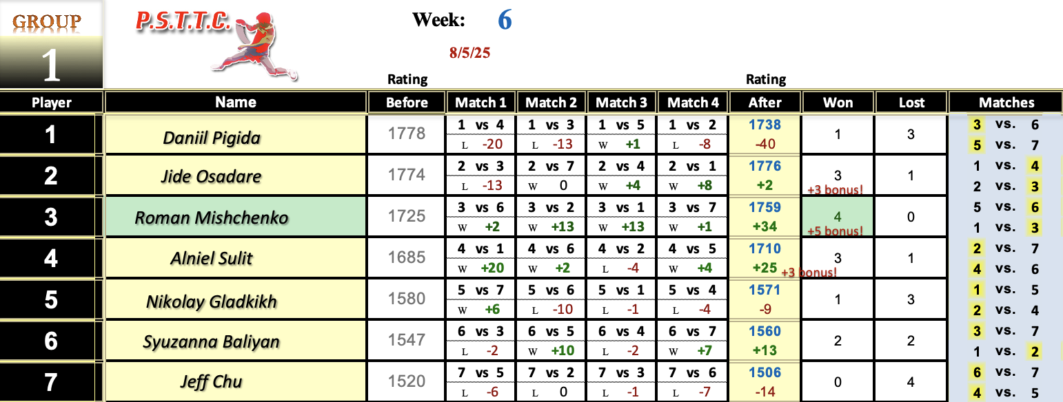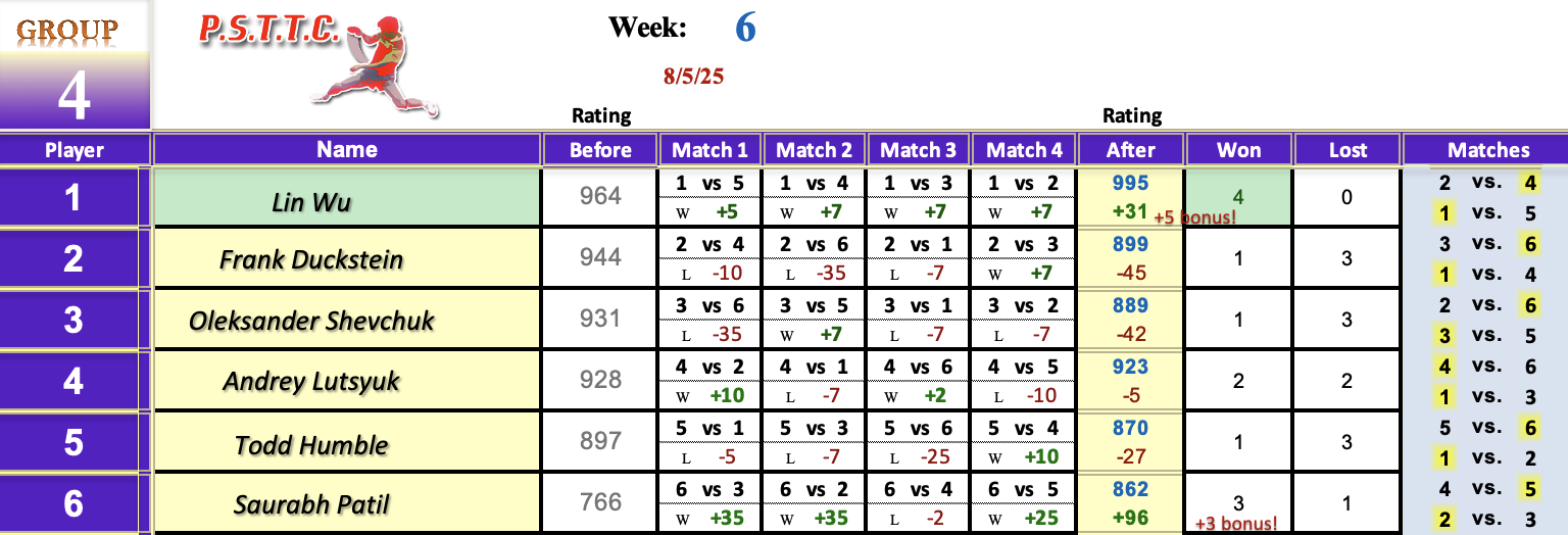 Please see below the results from Tuesday’s league at PSTTC. Congratulations to Roman, Lin, and David; they all were 4 and 0! 👏