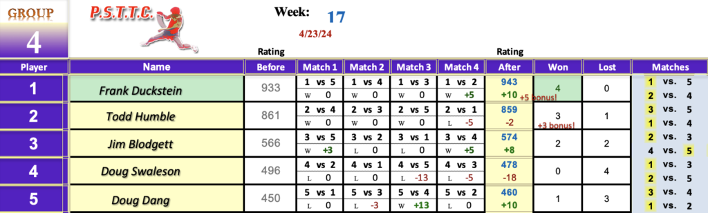 Please see below the results from Tuesday’s league at PSTTC. Congratulations to Jide, Loy and Frank; they all were 4 and 0! 👏
