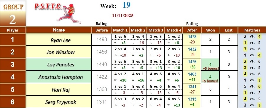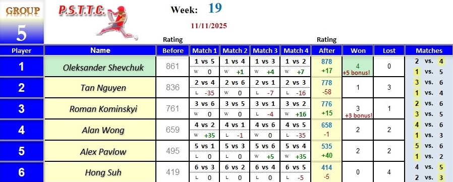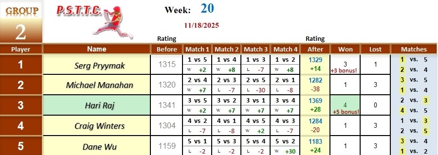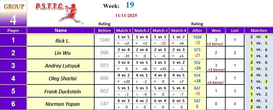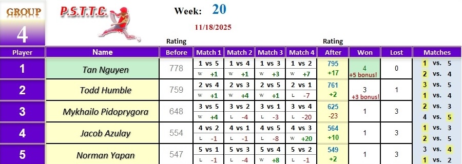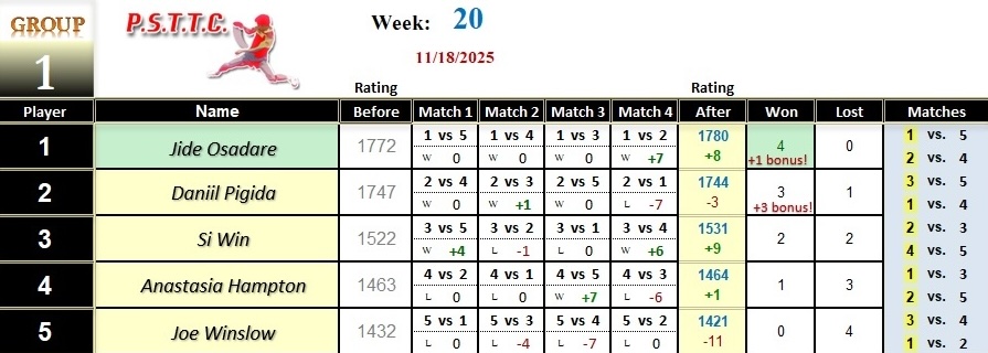 Please see below the results from Tuesday’s league at PSTTC. Congratulations to Jide, Hari, and Tan; they all were 4 and 0! 👏
